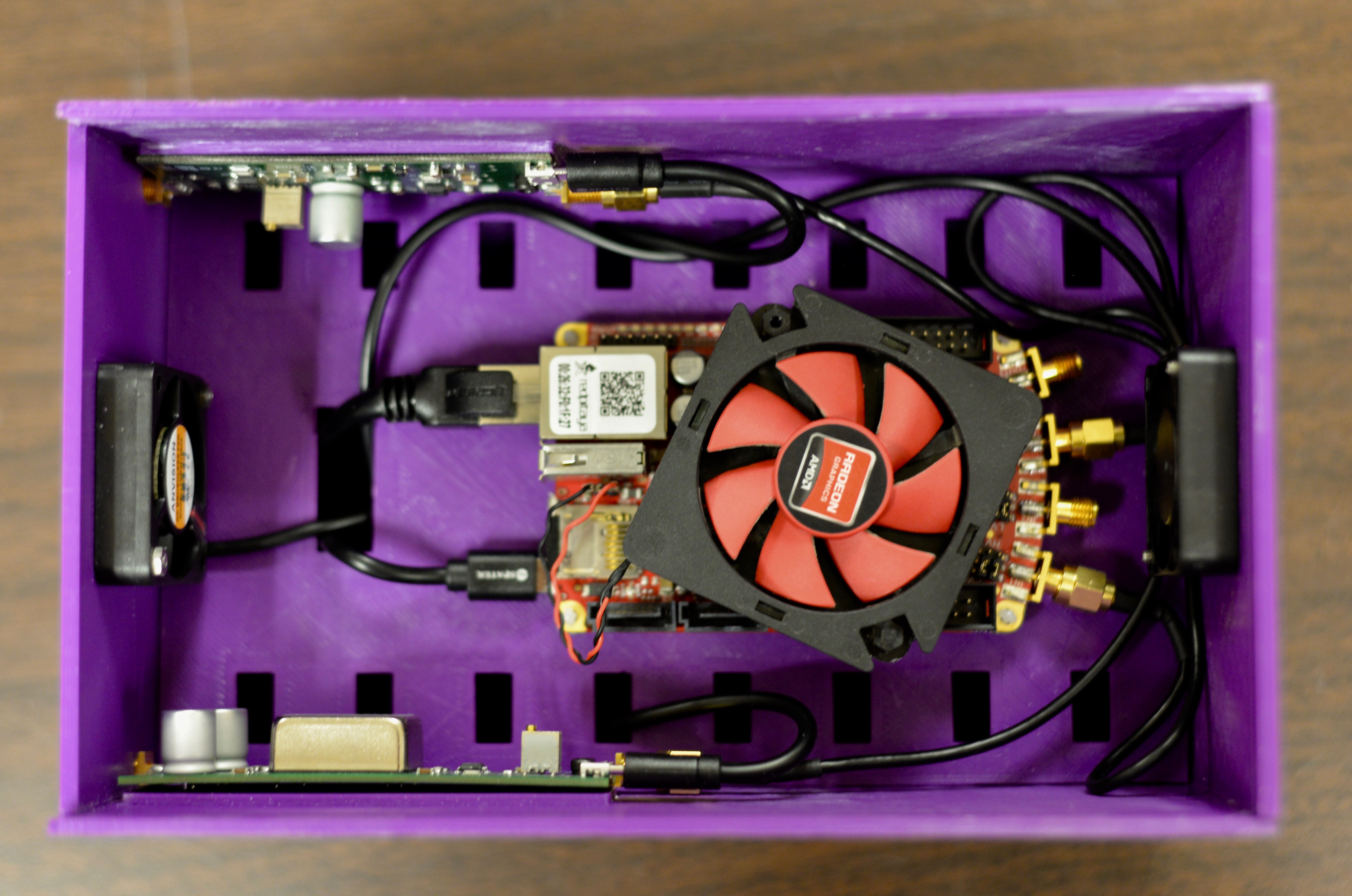 Our 3D printed box for our RUS components, the two amplifiers are mounted on the sides and the Red Pitaya is pictured center.